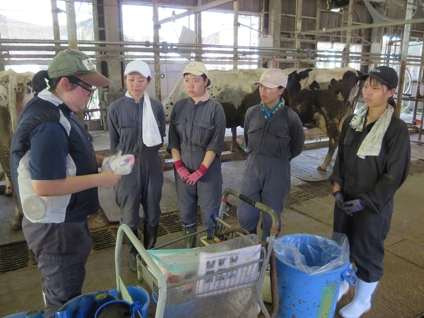 8月9日(金)、山口大学で研修を受けているJICA外国人研修員3名(獣医師2名、家畜人工授精師1名)等が本校を訪問し、施設見学と本校学生との交流を行いました。