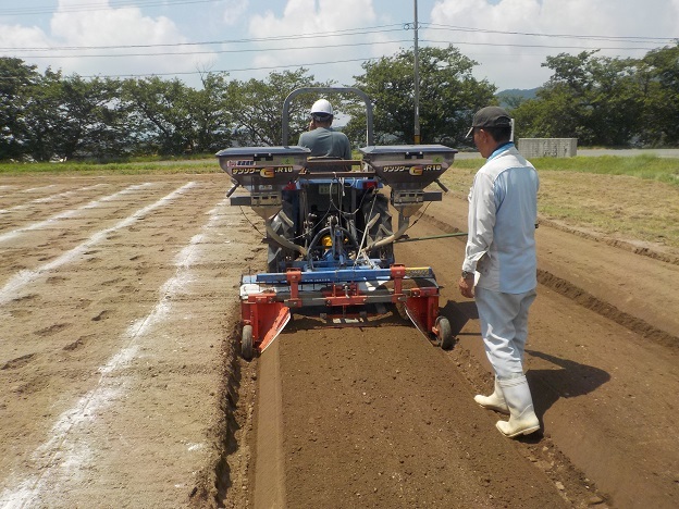 トラクターに専用の施肥機を接続し、耕うん・畝立て・施肥を同時に行います。施肥機にはGPSセンサーが付いており、トラクターの速度に合わせて施肥量を調整します。これにより、広いほ場においても肥料を均一に施用することが可能となります。