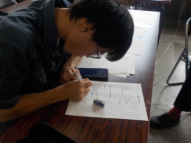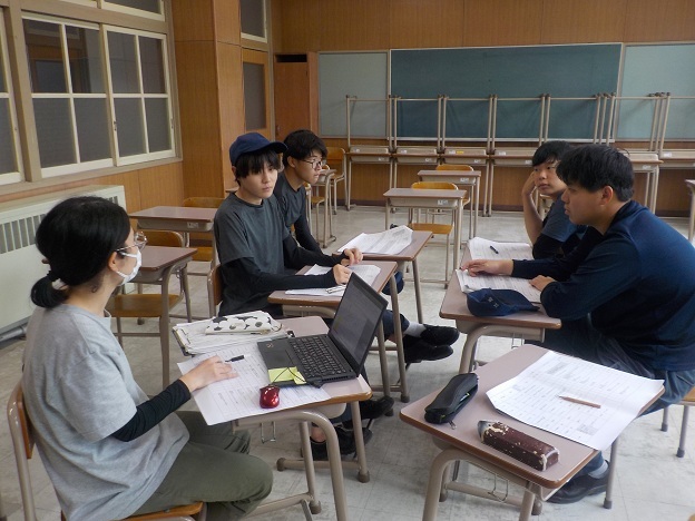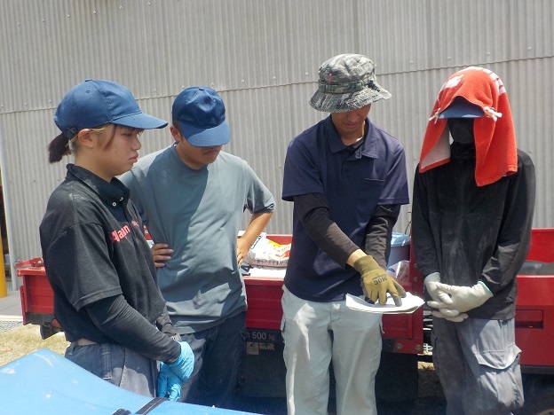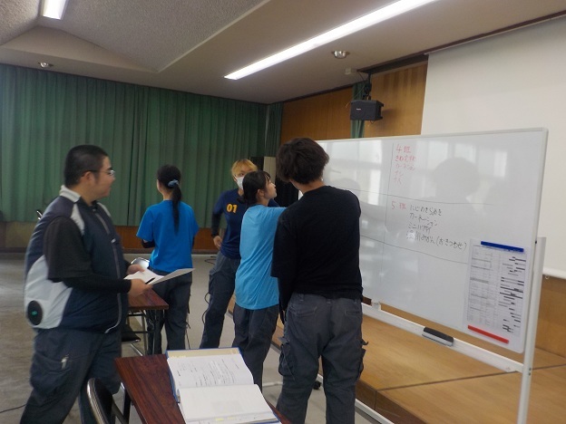この日は、1年生3人、2年生1人が1項目ずつ読んで、リスクを理解し、対策が十分か話し合いました。現在、ブドウの収穫調製でとても忙しい時期ですが、日ごろの作業を客観的に見て考える機会となりました。リスク評価は、あと数日に分けて行い、より安全性の高い作業体系を考えていきます。