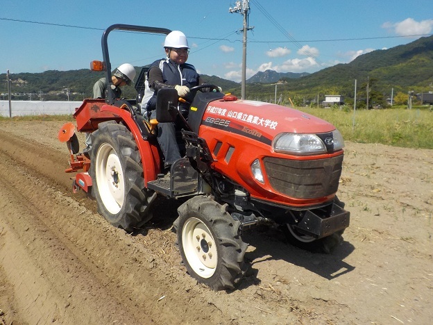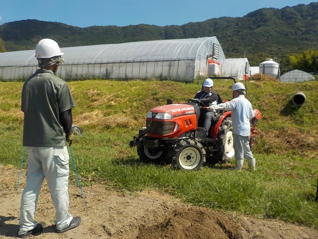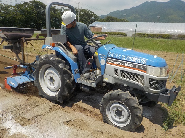 8月20日(水)、集落営農法人へ研修に行く園芸学科野菜経営コースの3名が、土地利用学科の先生からトラクタの取り扱いを学びました。