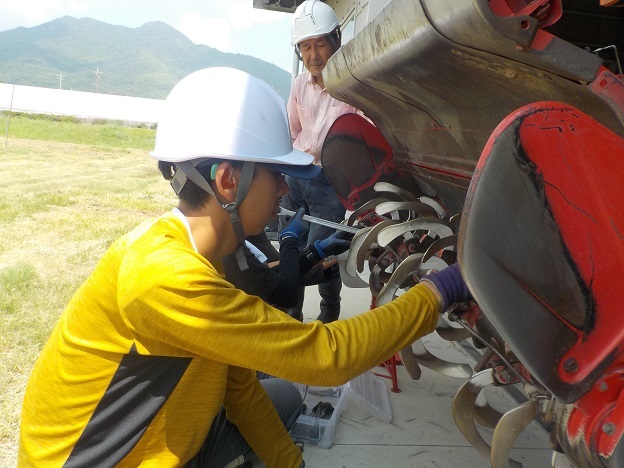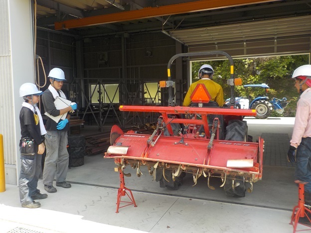 法人では9月は農繁期で、大型機械を見たり操作する場面も想定されます。このため、トラクタの構造や始動時の注意事項を再確認し、ロータリーの爪交換を行いました。