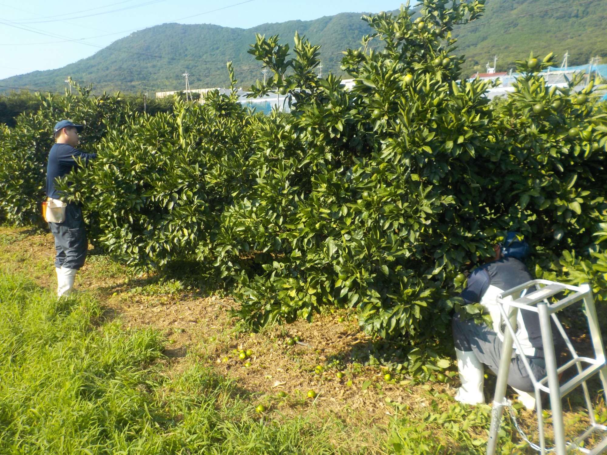 蒸し暑い日でしたが、2人はスピードアップも意識しながら摘果していました。