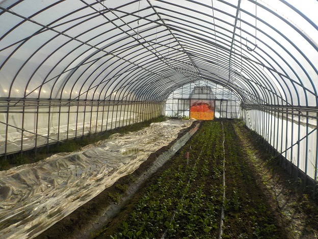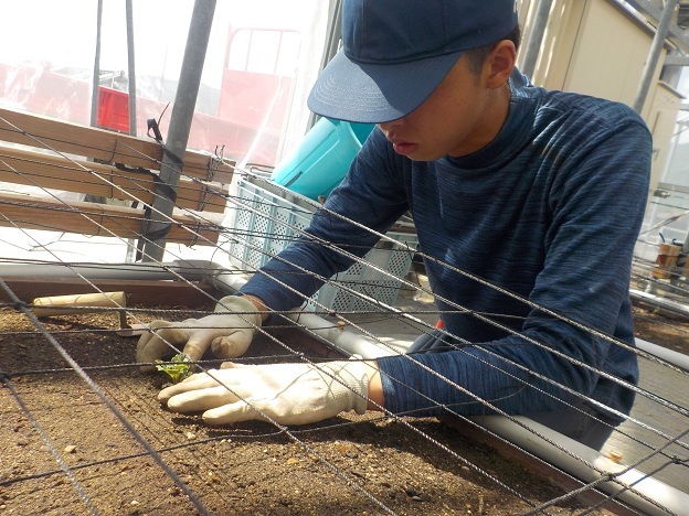 この日は、2年生1人と1年生1人がガラス温室の中で専用の器具で植穴を開けては鉢上げした苗を植え付けるという作業を、420株分繰り返しました。秋作は生育が早く進むため、直ちに誘引ヒモの準備に取り掛かります。