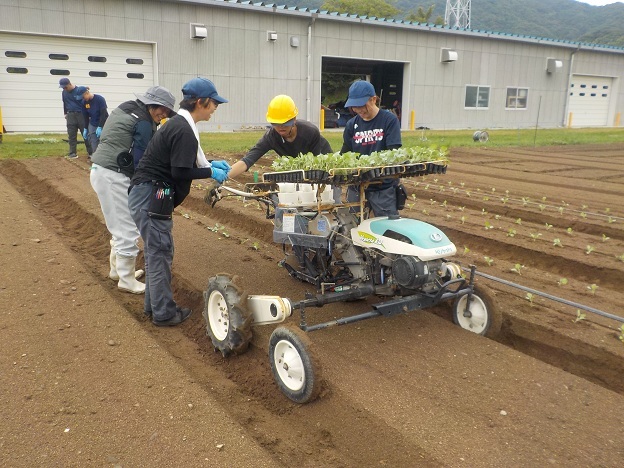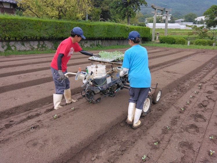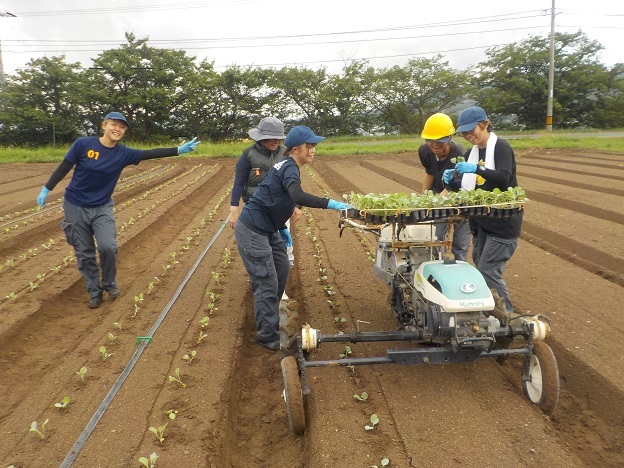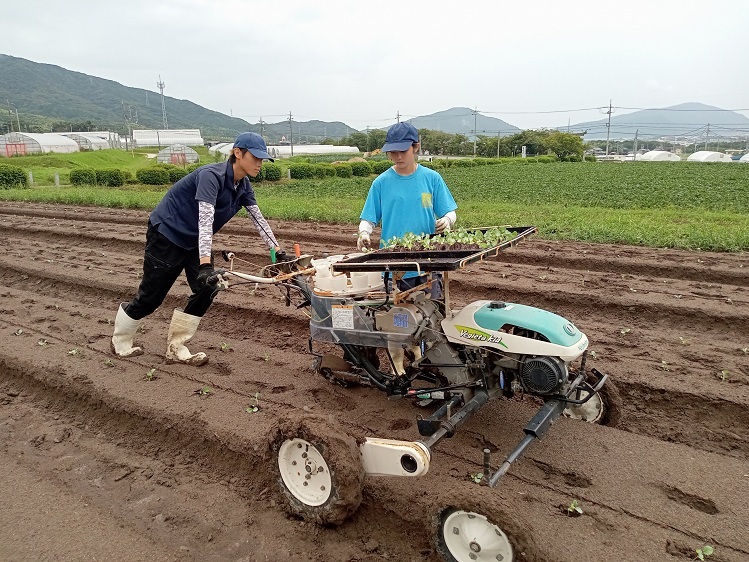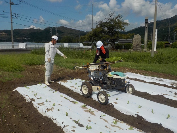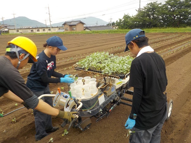 そして9月10日、「野菜移植機」を使って、ブロッコリーの定植を行いました。この日は雨の合間を縫って、また雨雲が迫る中での作業でしたが、学生達は作業を交代しながら上手に協力し合って、作業に取り組んでいました。