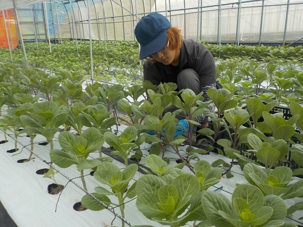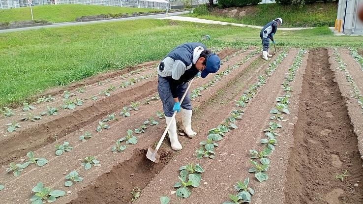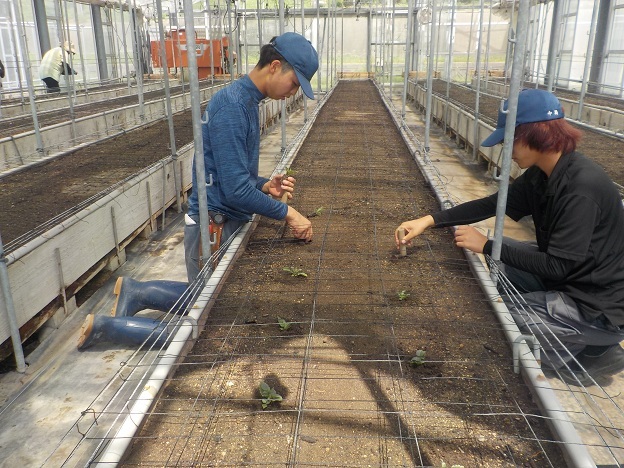 8月27日(水)、園芸学科野菜経営コースでは、2年生2名、1年生6名が冬キャベツを植えました。