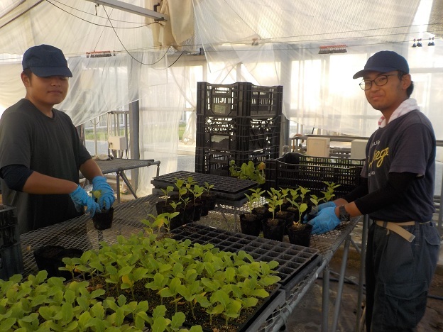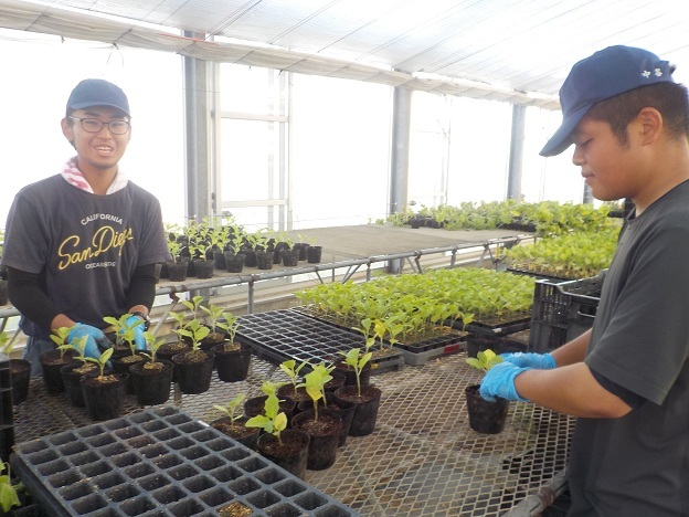 9月3日(水)、園芸学科野菜経営コースでは、1年生2名が育苗ハウスで、接ぎ木に使う台木(だいぎ)用のナスの鉢上げ(育苗トレイからポットに植え替え)を行いました。