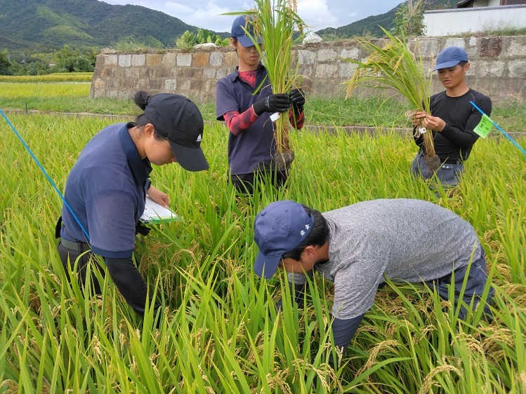 収穫時期である9月は2年生が長期研修中で不在のため、坪刈りは毎年1年生の役目。これはとっても重要な役目ですね。坪刈りのデータは卒業論文の内容を左右しますので、失敗は許されません。今年初めての坪刈りの日(9月12日)、1年生は作業手順について教官から指導を受け、間違いのないよう丁寧に作業を行っていました。坪刈りで刈り取った水稲は10月以降に玄米にして、収穫量を調べる予定です。