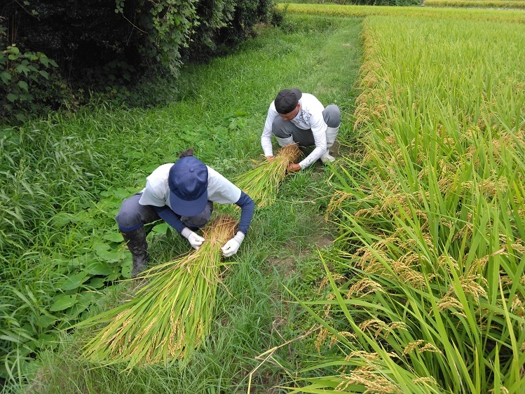 稲刈りといえば、気持ちの良い秋晴れの中での作業というイメージですが、9月中旬にもかかわらずこの日の最高気温は34.6℃!! 非常に蒸し暑い中、汗びっしょりになりながらの稲刈り始めとなりました。