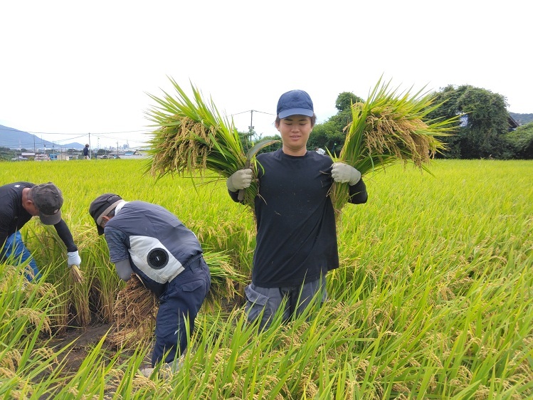 土地利用学科は9月16日(火)、今年最初の稲刈りを行いました。品種は、今年から栽培を始めた「にじのきらめき」。