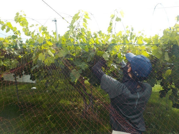 2名は伸びた新梢を、手際よく棚下に下ろして、適切な長さで摘芯していました。