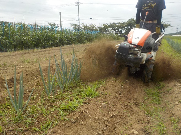 管理機で溝の土を耕耘して跳ね上げ、ネギの株元に寄せます。両側から土寄せして、5cmくらい深くなりました。太く長い白ネギになるよう、今後も生育に合わせて土寄せを繰り返します。出荷は年明けの予定です。