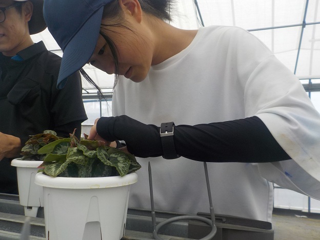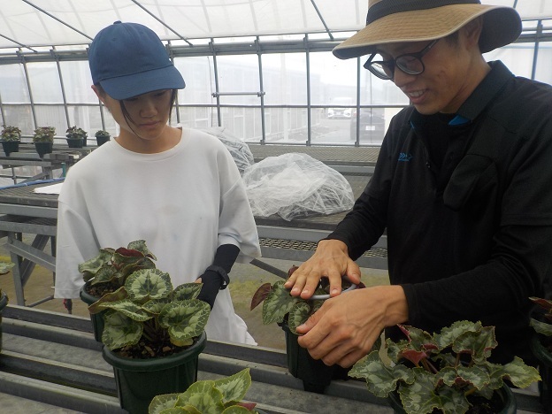 9月24日(水)、園芸学科花き経営コースでは、1年生2名がシクラメンの葉組み(はぐみ)を行いました。