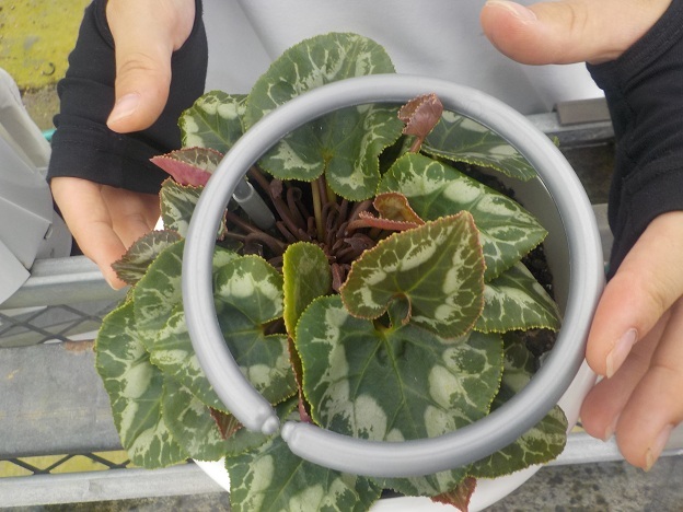 シクラメンの品質向上には、葉の枚数が非常に重要です。まず株の中心に近い葉を外側の葉の下に入れることで、中心に光が入るようにします。次に「葉組みリング」という専用の器具を差し込み、葉が中心に戻らないよう押さえます。株の中心に光を当てることで、新葉の生育を促すとともに、株の形を整える作業です。葉は次々出てくるため、販売するまでには数回、葉組みをしないといけません。
