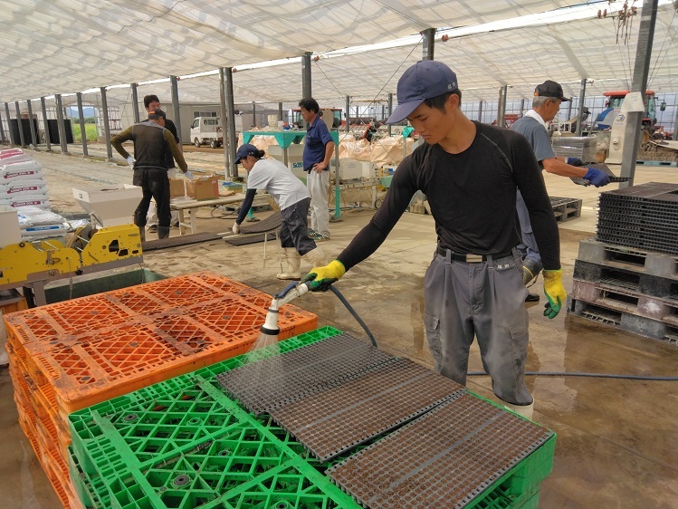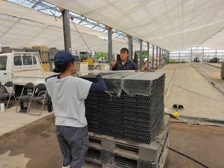 育苗ハウスで生育が良い苗を選び、栽培ハウスに運びます。そのハウスには、山口県が県内企業と連携して開発した「移動式らくラック」という高設栽培システムを導入しています。通常のハウスより1.7倍多く植えられるのですが、今回は県職員の研修と兼ねたので、2時間程度で終わりました。