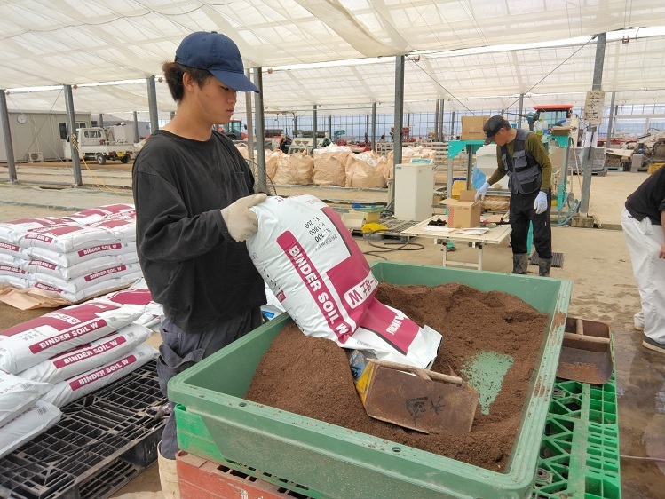 9月26日(金)、1年生5名がタマネギの播種を行いました。タマネギの播種は農大でも行っていますが、その方法は大違い。農大は畑に手で播きますが、ファーム大道は機械で苗箱に播きます。苗箱への土詰め、播種、覆土は機械が行うので、学生達は苗箱や培土(ばいど:良い苗を作るために物理的・化学的に調整・製造された土)と覆土の補給、播種した苗箱への水やり、積み上げた苗箱のラッピング(保湿して出芽を良好にするため)などを行いました。学生達の感想は、「楽な播種やった~」とのこと。