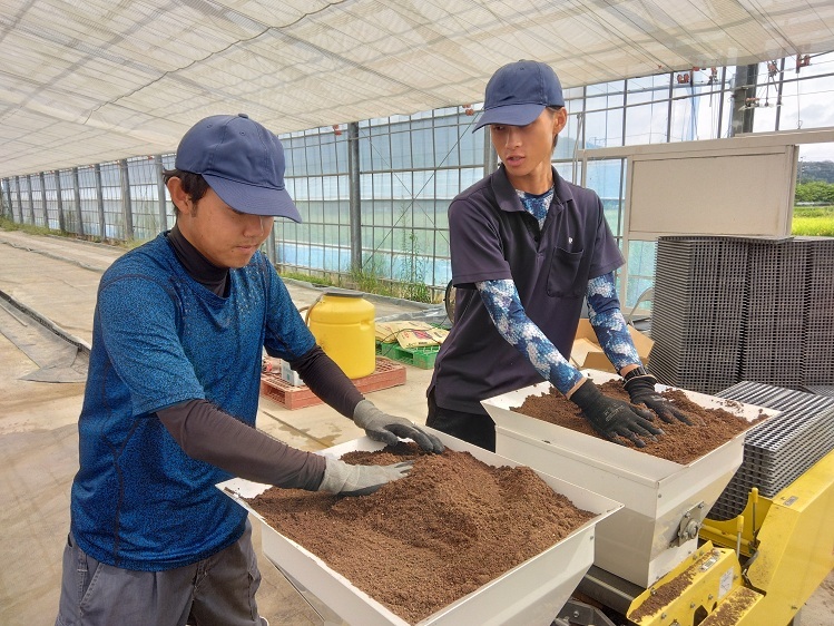 この日は、1年生1人と社会人研修生1人で、約1,000個の種をプラグトレイに播いていきました。