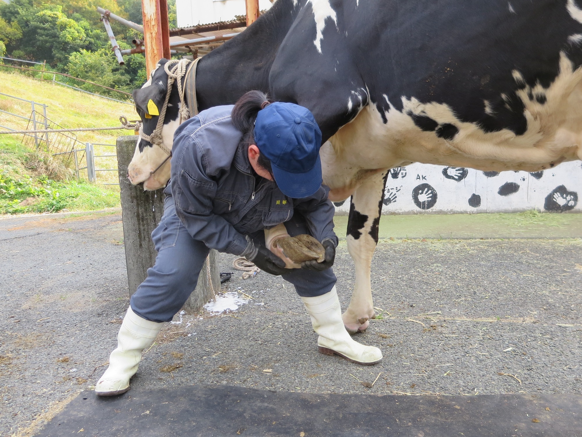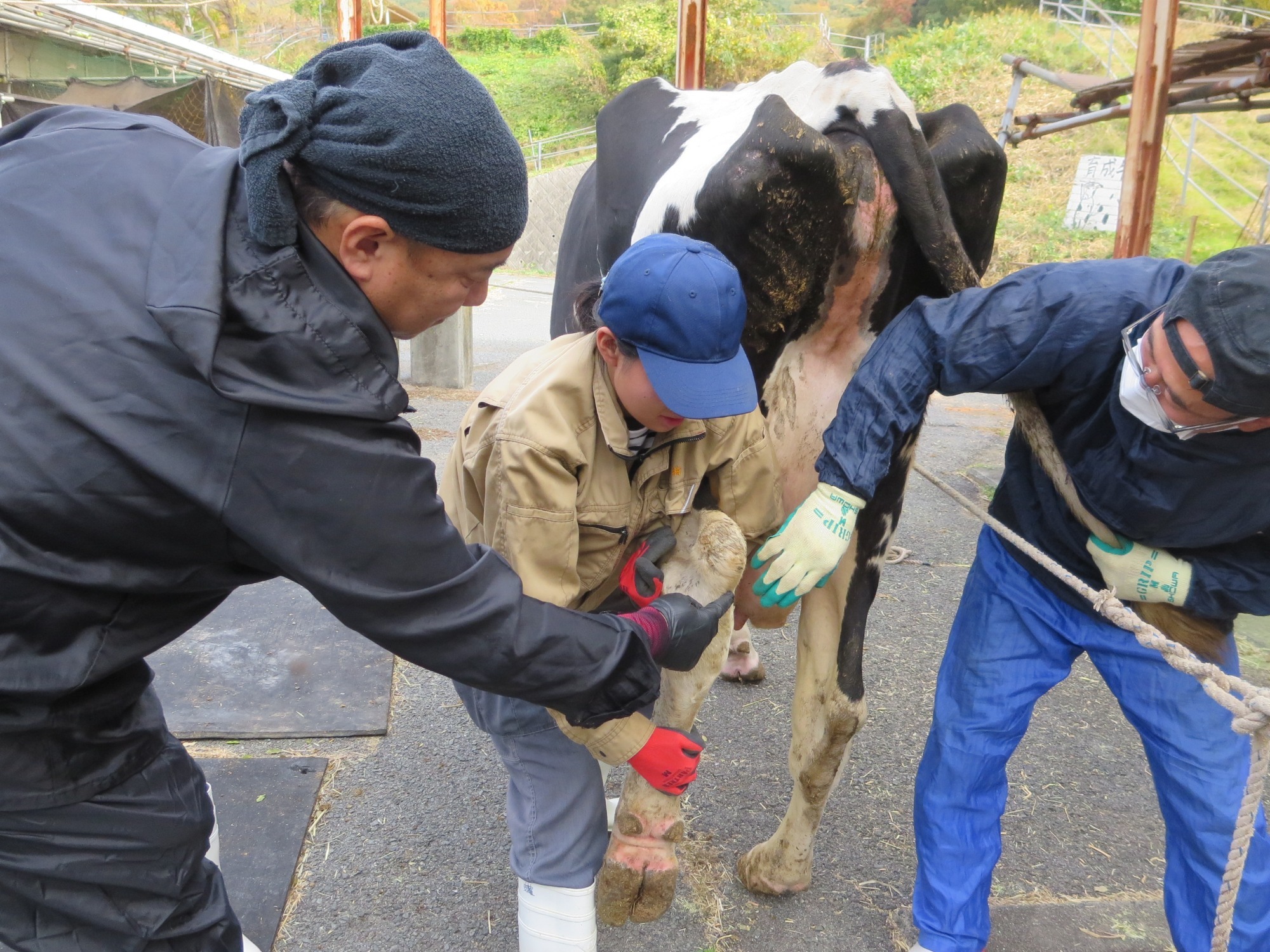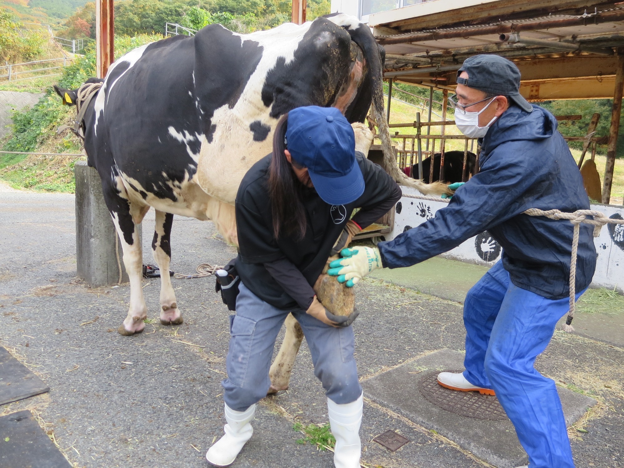 削蹄は牛の蹄の底も削るため、まず牛の脚を上げる必要がありますが、力任せでは上がりません。