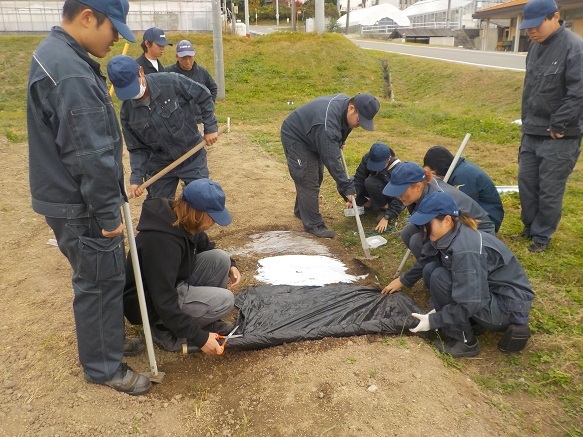 園芸学科1年生11名と研修生2名が、ほ場でマルチを張りました。講義「施設園芸」の中の実習で、「マルチの有無と種類によって、地温がどのように変わるのか」を理解するのが目的です。
