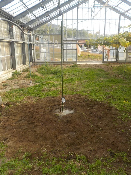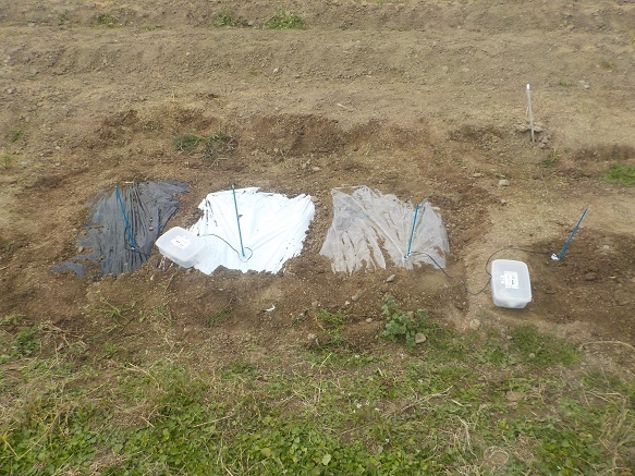 マルチは透明、黒、白黒の3種類を張り、温度測定器のセンサーを埋め込みました。結果が楽しみです!