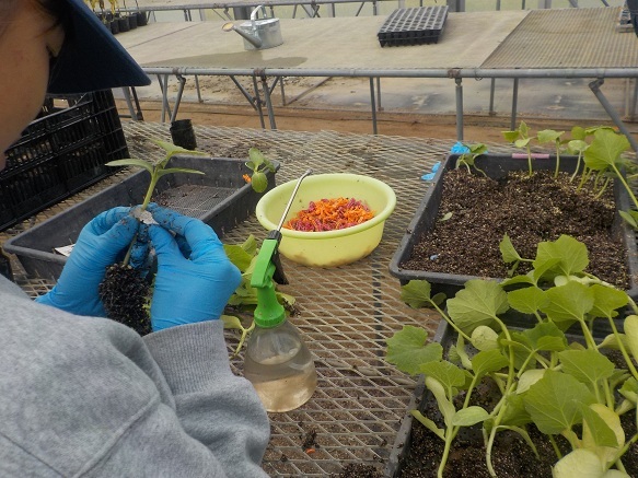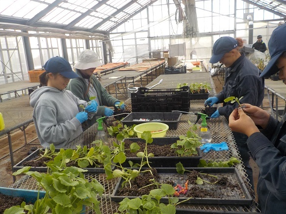 園芸学科野菜経営コースでは、1年生3名が経営プロジェクトに活用するキュウリの接ぎ木を行いました。
