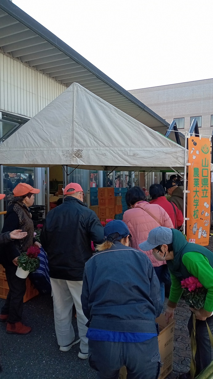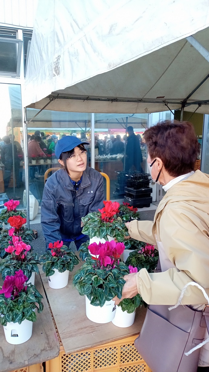 目玉商品のシクラメンは100鉢近くを持って行きましたが、昼までに完売!他にも新米や野菜などご好評をいただきました。3時間、ほぼ休まずに接客をした学生たちは、またひとつ成長したように見えました。ご来場いただいた皆様、ありがとうございました!