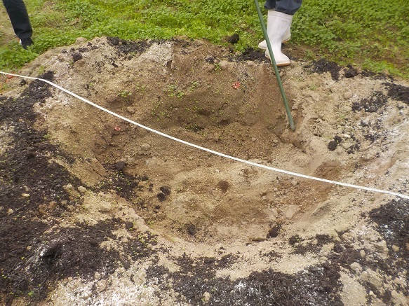 今回は、「ロザリオビアンコ」を「マスカサーティーン」に植え替えました。秋に「ロザリオビアンコ」の木を切り、根を抜き、バーク堆肥やマリンカルなどの土壌改良資材を施用して、植穴を準備しました。12月に「マスカサーティーン」の苗木が届いたので、早速植え付けを行いました。