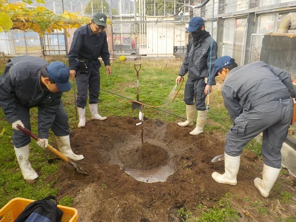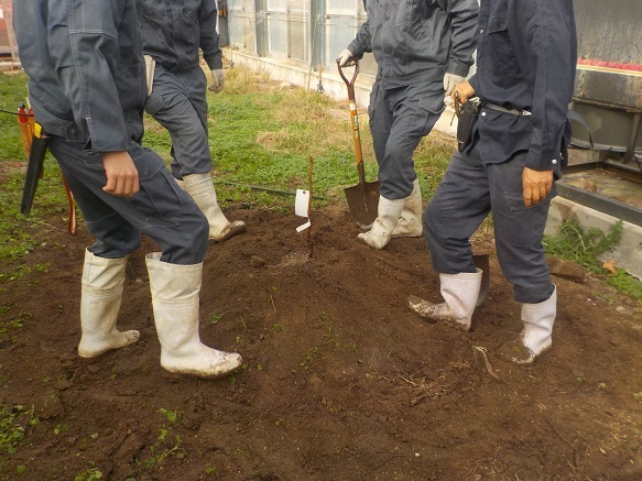 1年生3名は緊張していましたが、、先生の話をよく聞きながら、植え付けの手順を守って作業できました。この苗木が実を結ぶのは、早くて3年後です。その頃、学生たちはどうしているでしょう? 植えた時を思い出して、農大産の「マスカサーティーン」を口にしてほしいと思います。