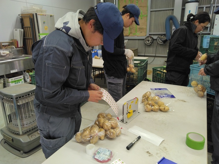 さて、拾い集めたジャガイモは、サイズ分けし、次々と袋に詰めて出荷します。これも今年2回目。みな手際よく作業を進めていました。しばらくはジャガイモの出荷が続きます。