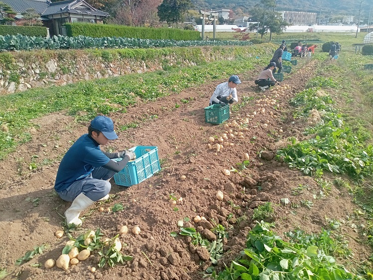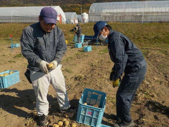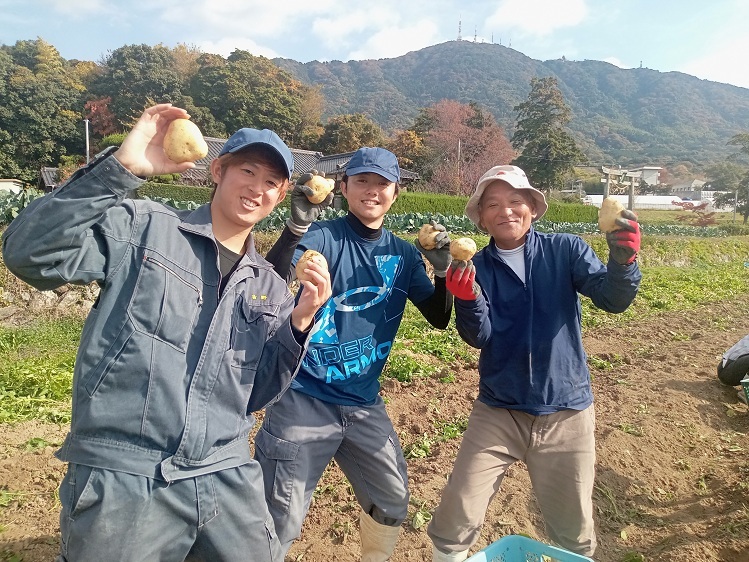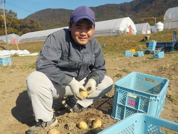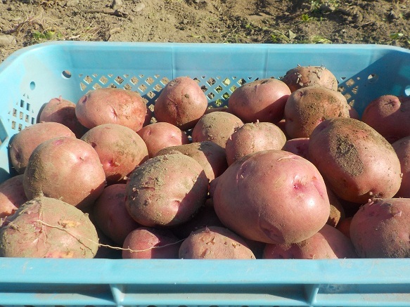 担当する2年生は、夏のほ場準備から始まって、やっと収穫になり、いい笑顔です。収穫後は冷暗所に置いて、少しずつ出荷を進めます。寒い季節のお料理に新じゃが、いかがですか?