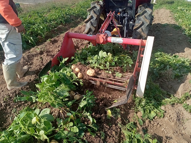 トラクターの後ろに付けた振動掘り取り機で掘り上げた後、軍手でこすって土を落としてはコンテナに入れます。4品種を一気に収穫しました。皮が赤い品種もあり、品種ごとに収穫量などの違いなどを確認します。