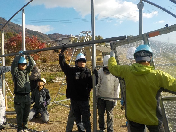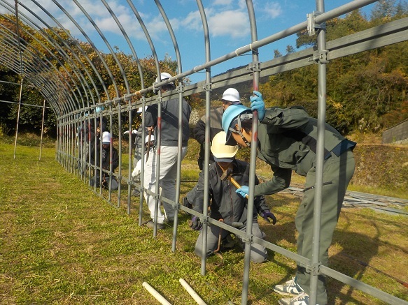 園芸学科の2年生9名と研修生2名が、パイプハウス建設を行っています。