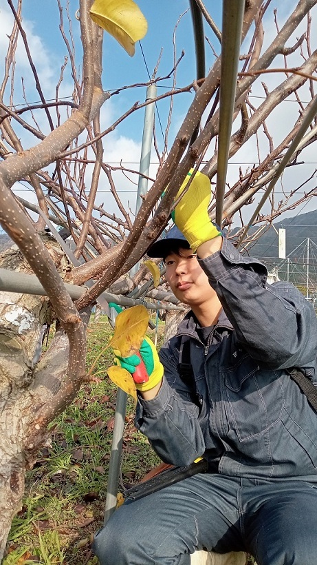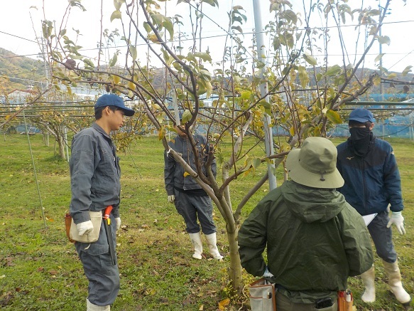 園芸学科果樹経営コースでは、1、2年生の計4名がナシ園のせん定を始めています。せん定は、ナシの樹が休眠する冬期の重要な作業です。