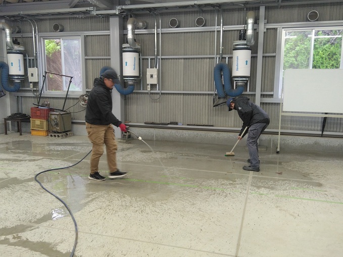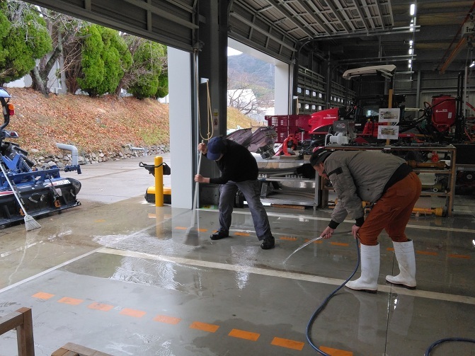 教室は床をきれいにモップ掛け。工作室や機械格納庫は泥やほこりを水で流し、デッキブラシでゴシゴシ。溝に溜まった沢山の落葉をせっせとすくい上げ。洗車場も水を抜いて、泥さらい。みんなが分担し、いつも使っている場所をキレイにすることができました。まぁ、普段から整理整頓を心掛けているので、そんなに大変ではなかったかな?